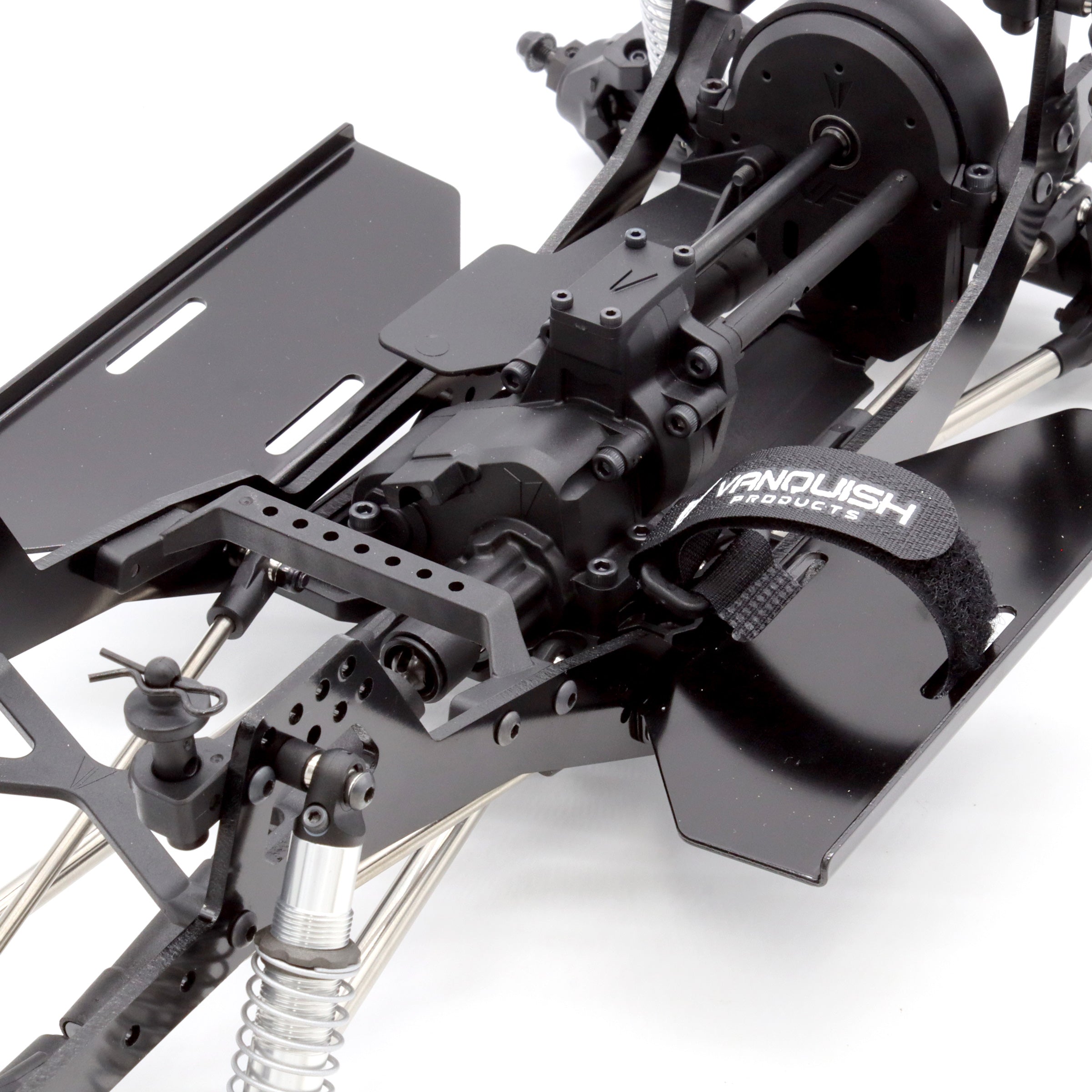 The Vanquish Products VRD chassis is equipped with molded chassis components that provide a tunable platform to adapt to the most demanding terrain. Multiple shock and body mounting positions combined with minimalistic front/rear interchangeable bumpers make body mounting and fitment straight forward. Stamped aluminum rock sliders provide a flat location for electronics and/or battery mounting and are able to support and protect your body.