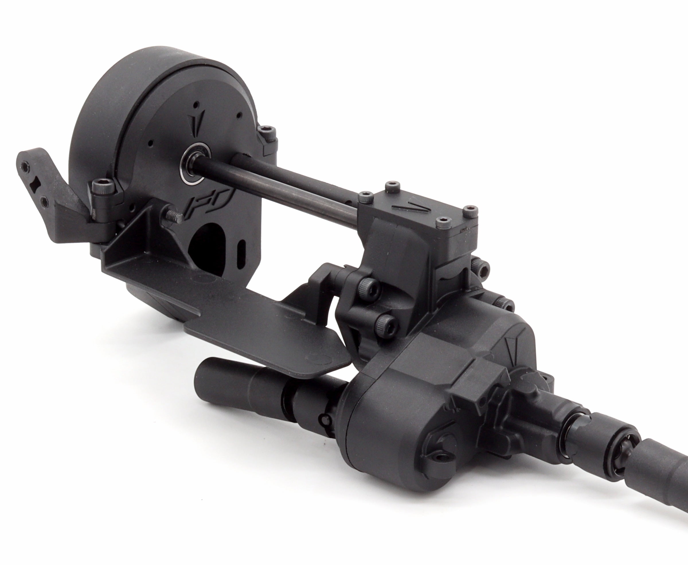 The VFD is designed for optimal performance, scale appearance, strength, and versatile accessories. It positions the motor forward and low for ideal weight distribution. The VFD Spec transmission offers a 6.5% overdrive for improved turning and climbing without stressing electronics. The T-case features replaceable bearing plates for adjustable positioning and optional gear ratios. Compatible with 540 brushed and brushless motors*.