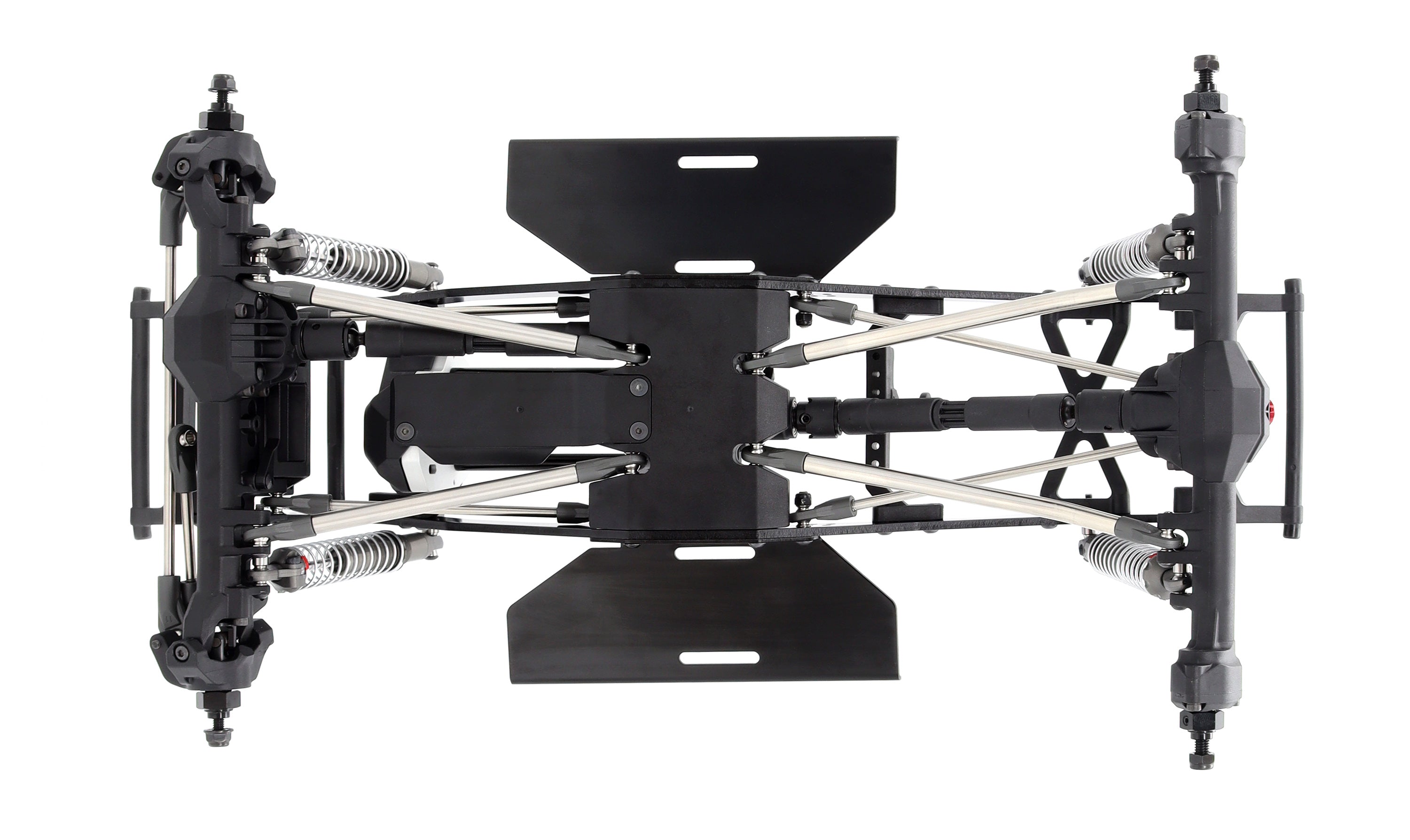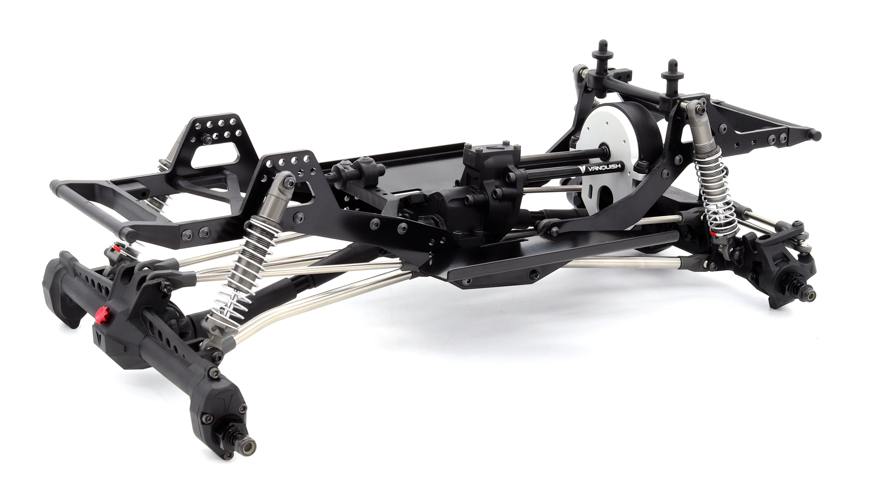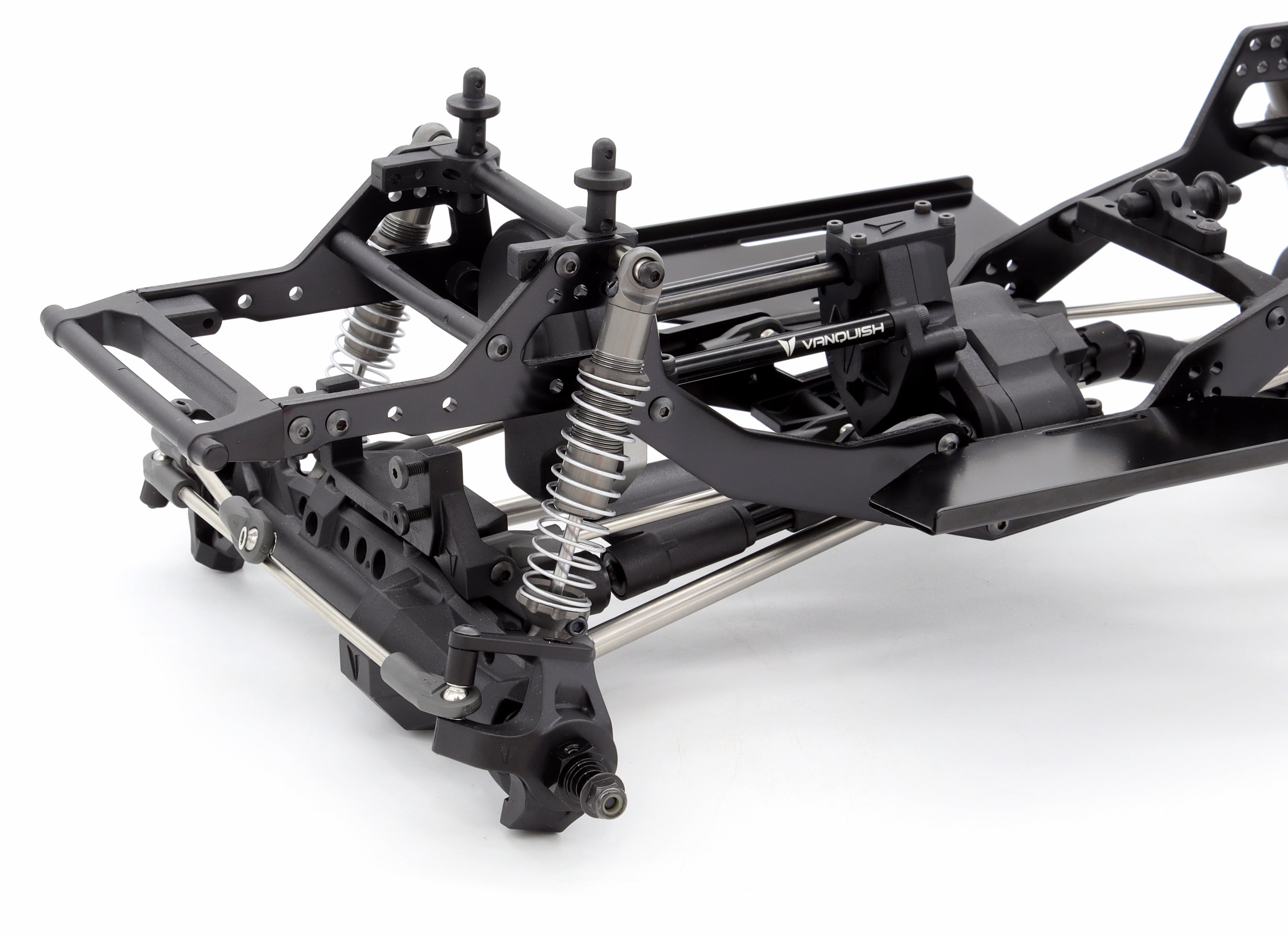The Vanquish Products VRD S25 chassis is equipped with molded chassis components that provide a tunable platform to adapt to the most demanding terrain. The S25 has been optimized for the new axle configuration with a new shock mounting positions and reduced rear overhang. Multiple shock and body mounting positions combined with minimalistic front/rear interchangeable bumpers make body mounting and fitment straight forward. Stamped aluminum rock sliders provide a flat location for electronics and/or battery mounting and are able to support and protect your body.